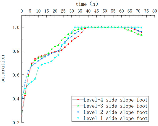 Under the action of rainfall, with the continuous increase in rainfall time, the saturation variation trend of each slope foot of the rock-soil slope is shown in Figure 5. Slope I has the shortest saturation time at the foot of the slope, because it is close to the groundwater level, and the slope soil below the groundwater level is saturated by default. The way of rock slope soil rainfall infiltration from the monitoring point to the groundwater level is short, so the saturation time is short, and the rock slope soil stays saturated for a long time. At the foot of the fourth slope, the elevation is high, and the slope soil of rock keeps infiltrating in the process of rainfall. In the process of rainwater infiltration, it shows that the greater the intensity of rainfall, the longer the duration of rainfall, and the more obvious the change range of saturation. Therefore, in the process of rainfall, regardless of the pore structure of rock slope soil and the position of groundwater level, the change in rock slope soil saturation is the joint effect of rainfall strength and rainfall duration. After the slope soil is saturated and softened, the increase in pore water pressure and saturation leads to the decrease in cohesion and effective stress of the slope soil. Therefore, rock slope soil will have large settlement deformation in the consolidation process. In addition, after slope soil reaches saturation, saturated soil may also have seepage phenomenon, leading to failure in the slope soil skeleton.