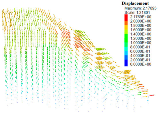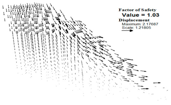 Using rainfall data from June 10–12 June 2015, the displacement vector of the slope was calculated by strength reduction method, as shown in Figure 6. The maximum displacement deformation of the slope occurred at the foot of the slope, and the deformation rate was fast, and the displacement amount was large.