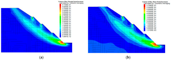 ③ At the foot of the slope, the increment of principal stress and shear stress was the largest, and the strain speed was the fastest. The maximum increment values of principal strain and shear strain were 0.412 and 0.579, respectively, as shown in Figure 7. A significant plastic penetration area was formed in the slope, and any external force broke the stress equilibrium state of the slope and slid along the potential sliding surface of the plastic penetration area. The foot of the slope slid at the stress concentration, and its deformation rate was fast, and the displacement was large. The displacement at the top of the slope was mainly induced by the joint action of the displacement at the foot of the slope, whose deformation rate and displacement amount changed with the variation at the foot of the slope, and the deformation rate was smaller than that at the foot of the slope.