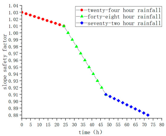 According to the data of rainfall from 10–12 June 2015, the stability of the slope was calculated, and the stability coefficient was calculated by limit equilibrium method. When rainfall lasted for 72 h, the slope stability coefficient Fs was equal to 0.88, as shown in Figure 10. Slope safety and stability coefficients all showed the law that the continuous safety coefficient of rainfall decreased, of which the difference was that the greater the strength of rainfall, the more sensitive the slope safety and stability coefficient changed. Meanwhile, the slope changed from critical failure state to dangerous collapse state. The slope produced a large-scale landslip from the 72 h rainfall to the stop of rainfall. After the stop of rainfall, the pore water pressure in the slope landslip gradually dissipated, whereas the water in the slope moved to the sliding zone, resulting in the increase in the slope weight and the gradual increase in cracks, resulting in the local stress concentration of the slope, which led to the slope sliding instability failure. Rainfall caused the slope to slide down on a large scale along the potential sliding surface, as shown in Figure 11 and Figure 12, which demonstrated that it was reasonable to judge the slope stability and failure according to the stability coefficient.
