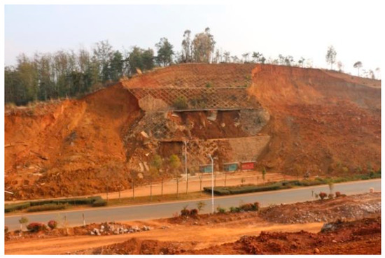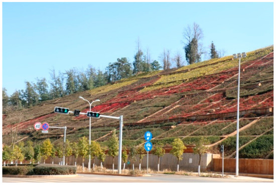 After calculation, the safety factor of the slope after treatment is 1.293. After four rainfall cycles, the slope shows no signs of landslip, indicating that the treatment measures of the slope are feasible and effective. The slope after treatment is shown in Figure 15.