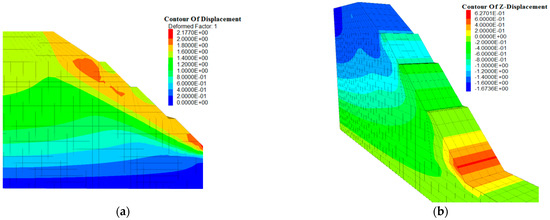 According to the calculated cloud map of the slope total displacement (Figure 14), the maximum total displacement occurred at the foot of the first and fourth slopes, which was 2.177 m (Figure 14a) (3). The displacement deformation also occurred at the step of Slope IV; the maximum displacement in the Z-axis occurs at the top of the slope (Figure 14b), and the displacement in the negative direction of the Z-axis is 1.673 m. On the other hand, the slope soil at the foot of the slope had a displacement of 0.6 m along the positive direction of the Z-axis, which was because the slope soil at the foot of the slope had been raised by 0.6 m due to the downward inclination of the trailing edge of the slope soil in line with the characteristics that the front edge of the slope surface bulges outwards, leading to the rupture and damage of the rubble slope protection at the foot of the slope. The actual sliding depth and position of the site were basically consistent with the simulation results.