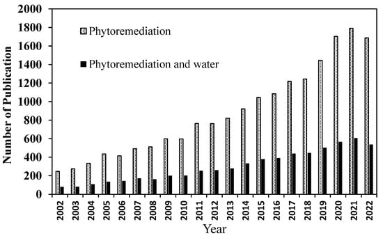 Phytoremediation is a promising green technology in wastewater remediation by using plants and microorganisms to eliminate, translocate, immobilize, or degrade the contaminants from the environment [8,9,10,11,12]. In other words, phytoremediation employs the fact that a living plant can act as a photosynthetic-driven pump proficient in eliminating pollutants such as metals and metalloids from the environment and water effectively [9,13]. Notably, aquatic plants play an essential role as a natural absorber in phytoremediation for heavy metals and contaminants with their extensive root systems, making them the best selection for the uptake of pollutants through their shoots and roots [1]. Phytoremediation technology has received global attention among scientists and administration bodies due to its effectiveness in lowering unparalleled environmental pollution via an environmentally friendly pathway. Figure 1 demonstrates the increasing trend for phytoremediation based on the data extracted from Scopus by using the keywords of “phytoremediation and phytoremediation and water” from 2002 to 2022.