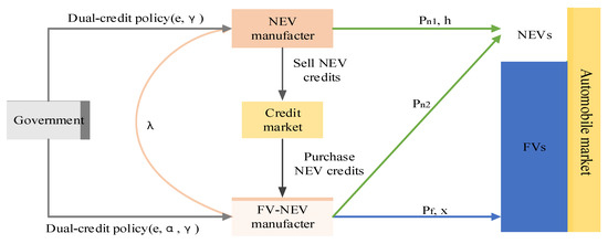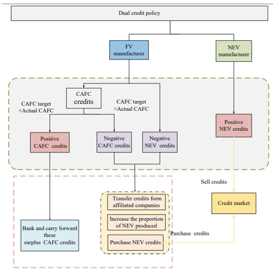 The Chinese government has been vigorously promoting the development of the NEV industry. In 2009, China issued the NEV subsidy policy. Although NEV production and sales exceeded 1.2 million units in 2018, driven by the subsidy policy, the following problems exist: First, long-term subsidies put enormous financial pressure on governments [8]. Second, manufacturers falsify and exaggerate NEV production to obtain subsidies [9]. Third, the subsidy policy promotes the increase in the production of NEVs, but neglects the improvement in technical level of FVs and NEVs [10]. As a result, China has entered a post-subsidy era [11], and the Chinese government proposed the dual-credit policy in 2017 [12].