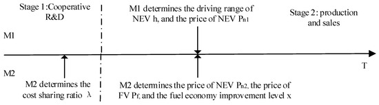 The game sequence between the NEV manufacturer and FV–NEV manufacturer is shown in Figure 3. In the first stage, the FV–NEV manufacturer determines the cost sharing ratio. In the second stage, the NEV manufacturer determines the driving range of NEVs, and the FV–NEV manufacturer determines the production, pricing, and fuel economy improvement level of FVs. The NEV manufacturer and FV–NEV manufacturer jointly determine the production and pricing of NEVs.