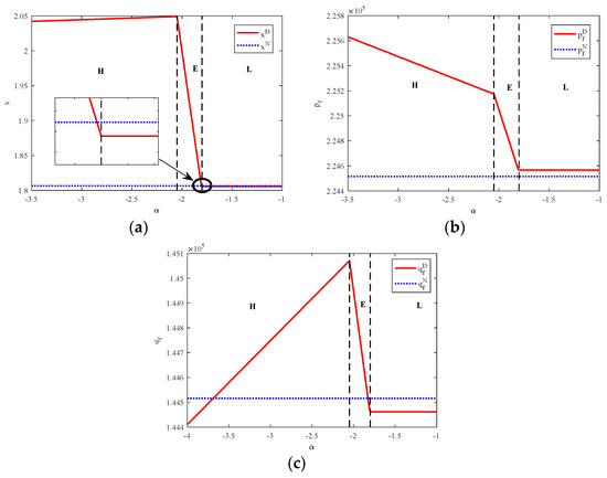 Proposition 2 reflects the relationship between the FVs price with and without the dual-credit policy. When FVs are in the high fuel consumption state, the relationship between the FVs price is not only related to , but also related to and . When FVs are in the equilibrium fuel consumption state, if is less than , the dual-credit policy will promote the lower price of FVs. When FVs are in a low fuel consumption state, and if is less than , the dual-credit policy will promote a lower price of FVs.