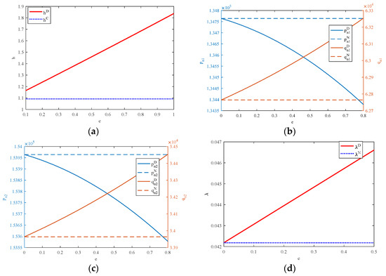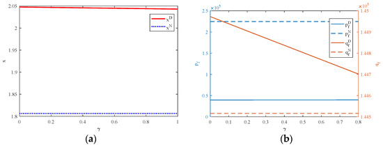 As can be seen from Figure 5a, the fuel economy improvement level under the dual-credit policy was much higher than that under no policy. Under the dual-credit policy, when increases, the FV–NEV manufacturer spent more resources on the production of NEVs, and the fuel economy improvement level gradually weakened. As can be seen from Figure 5b, under the dual-credit policy, the increase in may compress the production of FVs, but the impact on the pricing of FVs is minimal. The pricing of FVs under the dual-credit policy is always lower than that under no policy, mainly because the cost of credits is reduced by improving the fuel economy improvement level under the dual-credit policy, which in turn promotes the reduction of prices and an increase in production.