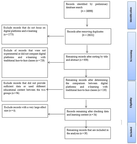 The final set of meta-analysis consisted of thirty publications and thirty-four effect sizes that were identified through a process of searching, filtering, coding, and extracting. The total sample size was (N = 8293) students who either studied via digital platforms (N = 3725) or through traditional face-to-face classes (N = 4568). The included samples of studies were published in a wide range of journals and conference proceedings. In addition, included studies were published between 2015 and 2021.