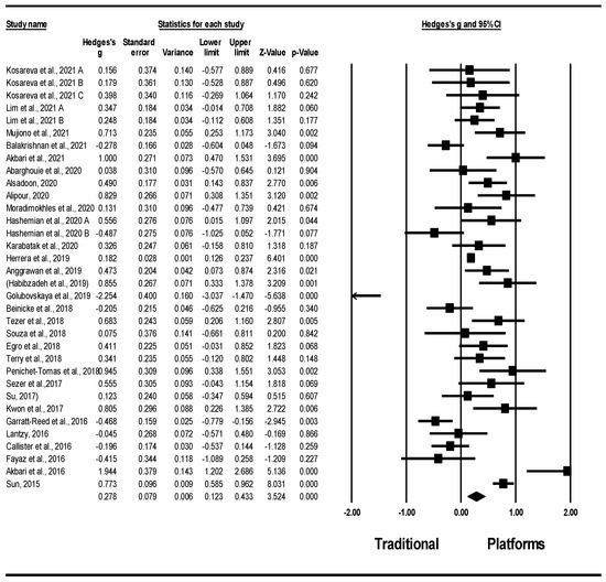 Basic conclusion of the conducted meta-analysis has indicated that digital platforms have a positive impact on students’ learning outcomes. This analysis that consisted of 8293 students, and revealed an effect size of g = 0.278 according to the random effects model, which is considered as a small positive effect according to Cohen’s criteria [81]. It also showed that there was no publication bias through the use of three bias assessment methods, mainly, visual inspection of the funnel plot, Classic fail-safe N test, and Orwin’s fail-safe N test.