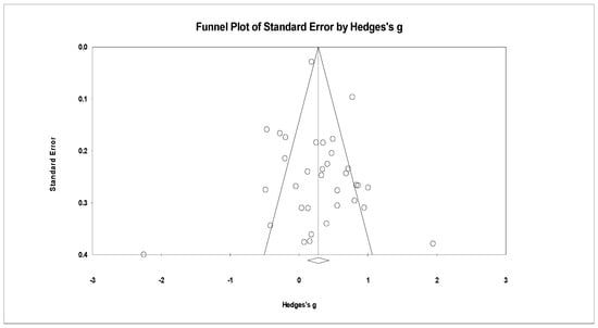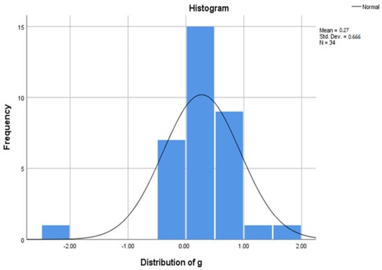 Hedge’s g was normally distributed as shown in Figure 3. The overall effect size using the random effects model was g = 0.278, which was a small effect size [81]. The overall effect size was statistically significant at Z-value = 3.524, p < 0.001 and a 95% confidence interval ranging from 0.123 to 0.433. Nevertheless, the size of the observed effect varied from one study to another, and a certain amount of variance was expected due to sampling error. The Q-statistic value provides a test for the null hypothesis stating that “all studies involved in the analysis share the same effect size [80].” The Q value was 188.16 with 33 degrees of freedom and p < 0.001.Thus, the null hypothesis that the true effect size is identical in all studies can be rejected. The value of I2 = 82.462% indicates that the observed variance ratio reflects differences in true effect sizes rather than sampling error [80]. Higgins–Thompson [108] suggest that I2 values around 25%, 50%, and 75% can be interpreted as low, medium, and high, respectively, in heterogeneity. Besides, I2 of the general model shows a high level of heterogeneity and indicates that one or more mediating variables, other than sampling error, can explain this variance in these data. Thus, exploring potential mediating variables in these data to predict and explain variance is essential. So, exploring the potential intermediate variables in the form of contextual elements of studies is important.