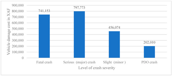 - Human Costs, which include the intangible costs of lost life years and reduced quality of life from pain and grief resulting from RTCs by victims or relatives, were estimated as a sum-total of the cost from fatalities, serious injuries and slight injuries (Equation (6)). To estimate the human cost of fatalities, a value transfer function for LMIC as presented by Milligan et al. [22], was used to estimate the value of a statistical life (VoSL) in Cameroon. Consumption loss resulting from fatalities is subtracted from the VoSL, since this component is included in the gross production loss function (see Equation (7)). Borrowing from Wijnen [28], human costs of slight and serious injuries were estimated as a percentage (13% and 1%) of VoSL, while assuming negligible (zero) consumption loss from injuries (see Equations (9) and (10))