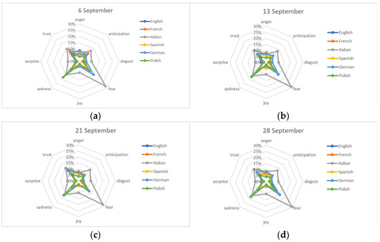 - Which are the major sentiments in each language? What is the trend of sentiment during the examined period?