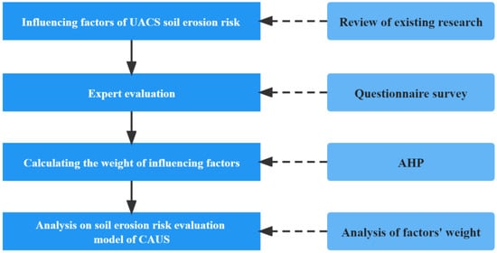 According to the implementation steps of AHP, this paper formulates the research process, as shown in Figure 2. Firstly, existing research on the influencing factors of soil erosion CSM will be reviewed to determine the influencing factors included in the risk evaluation model. The second step is to invite experts to compare these influencing factors in pairs by means of a questionnaire survey. Then, through AHP, the results of the comparison are calculated to obtain the weight of the influencing factors, judged by each expert; the geometric average value of the evaluation results of multiple experts is obtained to get the final weight result, and the soil erosion risk evaluation model of CSMs is established. Finally, the weight of the influencing factors in the model is analyzed.