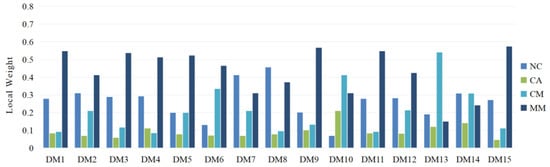 Table 6 shows the pairwise comparison matrix of 15 experts based on work experience and professional knowledge, in which the meanings of A, B, C, D, E and F are consistent with Table 5. Through AHP, the local weight results of nine DMs on the four dimensions are obtained, as shown in Figure 4.