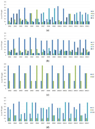 The local weights of the four dimensions are calculated. Similarly, for each influencing factor under the dimension, such as RI and RA, the values can also be calculated using the same method based on the evaluation results. The local weight results of the nine DMs for each influencing factor under the four dimensions are shown in Figure 5. After the geometric average, the local weight of each influencing factor is obtained. It is associated with the local weight of the influencing factors under the dimension, and the weight of each factor in the global is obtained, as shown in Table 8.