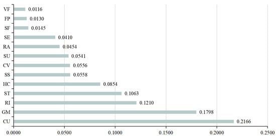 The 13 factors will contribute to the soil erosion risk of construction projects. It can be seen from Figure 7 that there are four main factors: CU, GM, RI and ST. Compared with other influencing factors, these four account for 62.37% of the total influence.