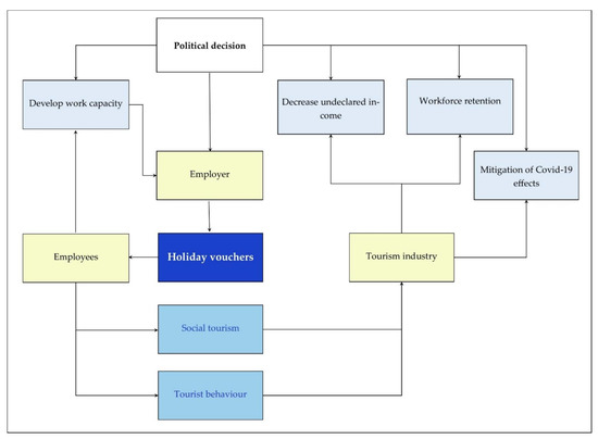Legislation and political decisions have a significant impact on the touristic phenomenon [1], and the decision to grant some holiday vouchers as well as the institutionalisation of companies reimbursing employees’ holidays can be an intervention lever in the tourism industry. Moreover, in the post-pandemic stage, countries are paying attention to implementing strategic measures in order to stimulate tourism demand [2], such as granting holiday vouchers. Social tourism developed in the 20th century to include ideas of social inclusion and welfare rights [3], which is why it has been described as an umbrella concept [4] to refer to its complexity, targeting economically weak or otherwise disadvantaged people. The basic principle is to enable access to travel and leisure opportunities for all [5], referring to the goal to include as many people as possible in tourism and leisure [6].