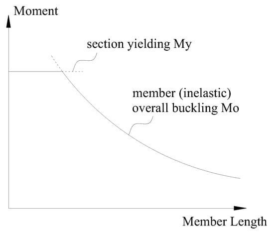 For a beam section without sectional buckling, the upper bound of its bearing capacity is the lesser of the section yielding moment My and the inelastic overall buckling moment Mo, as shown in Figure 1. Note that the first yielding moment My is generally adopted as an upper bound of cold-formed steel sections, although some extent of plastic reserve beyond My can be obtained in cold-formed sections of low section slenderness [18].