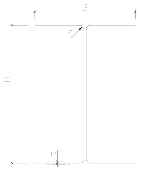 Sections adopted for the parametric study [35] were named using the convention “Alloy-I-L××”, where the Alloy was austenitic S30401, ferritic S44330, or lean duplex S32101 as per the ASTM unified numbering system [38] as briefly referred here as 304, 443, and 2101 respectively, and the L×× denoted the nominal local buckling slenderness. For example, 304-I-L11 represents an I-section made of 304 alloys with a nominal slenderness λl = 1.1. The sections used for the parametric study are listed in Table 1, using the dimensional nomenclature illustrated in Figure 2. The E0, f0.2, and n in Table 1 are respectively Young’s modulus, nominal yielding stress, and Ramberg-Osgood index of the alloy used, which are also employed in the later sections in strength prediction formulae.