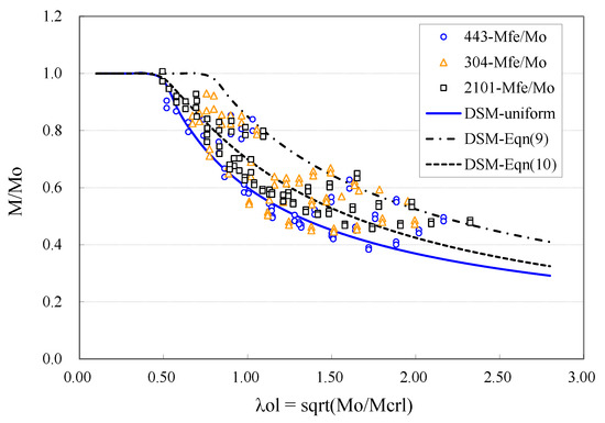 For comparison, the existing DSM formulae Equations (9) and (10), and the proposed Equation (11) in this section are collectively plotted in Figure 3, which are labeled as “DSM-Equation (9)”, “DSM-Equation (10)” and “DSM-uniform” respectively. As seen from the figure, the Equation (9) curve, codified in AS/NZS4600 for carbon steel beams, nearly follows the upper boundary of the data band and therefore is much too optimistic for stainless steel beams design. The DSM-Equation (10) curve, as transformed from the stainless steel column formula in [12], lies approximately in the middle of the data band with slightly more data points below it and fewer above it. The curve, therefore, represents the general strength varying trend reasonably well but is on the unsafe side. The DSM-uniform curve derived here for stainless steel beams lies just above the lower bound of the data band with the majority of data points above it. It serves as a proper design curve with an adequate safety margin.