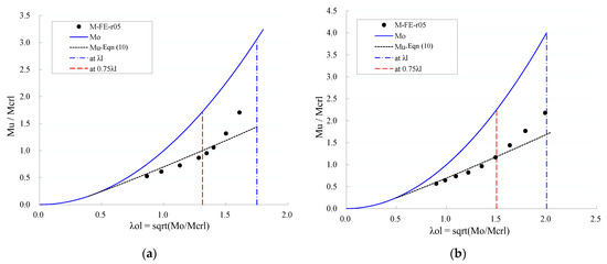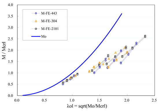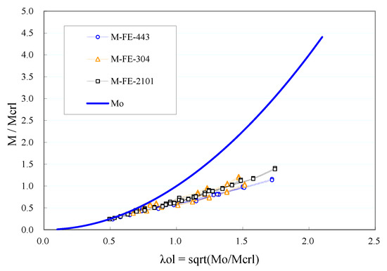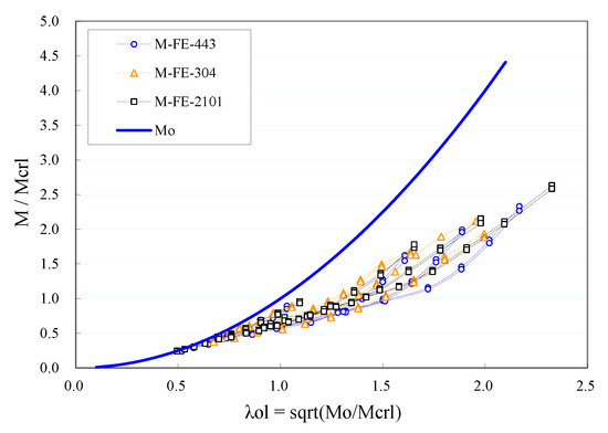Beams of the same cross-section and different member lengths were collected. Recalling the slenderness definitions in Equations (7) and (8), the members should have the same section slenderness λl but different relative slenderness λol. Their strengths were normalized with Mcrl and plotted against λol in Figure 4 (two typical sections are given as an example, and only the member strengths for 0.5° initial twist rotation were plotted for simplicity). For comparison, the inelastic overall buckling moment Mo is also plotted in the figure, which takes the shape of a parabolic curve (appreciate this by recalling that Mo/Mcrl = λol2). The deviation of data points from the Mo curve implies the deteriorating effect of section local buckling. The DSM curve of Equation (10) is also plotted in Figure 4, which demonstrates a nearly linear trend as can be expected from the above analysis. Note should be taken about Figure 4 in that the member strengths normalized with elastic local buckling moment (M/Mcrl) can exceed unity due to the post-local buckling strength reserve. This is different from Figure 3 where the strengths were normalized with the inelastic overall buckling strength, which was a theoretical upper bound of strength, and therefore the values (M/Mo) were always lower than unity. Note also that the lower values of λol correspond to lower values of Mo which implies longer members.