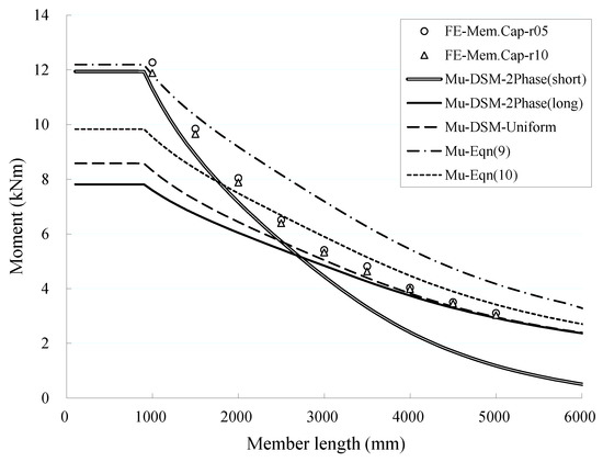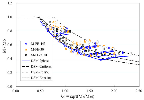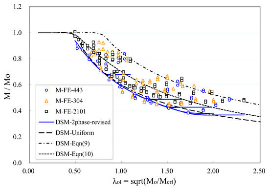 The parametric study strengths and the strength curves predicted by Equations (13)–(15) are normalized with Mo and plotted against λol in Figure 8. As seen from the figure, the two-phase DSM gives a single curve for long members and multiple curves for short members as a result of including the variable λl in the DSM expression. Note also that the two-phase design curves in Figure 8 demonstrate a “descending + ascending” varying trend with increasing slenderness. This is different from the traditional DSM curves, which feature a monotonically descending trend with increasing slenderness (see Figure 3). The slightly ascending trend in the short-member design curves is probably a result of the development of plastic deformation and corresponding plastic strength reserve in short members.