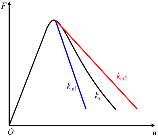 The load–deformation curve during the loading process of the testing machine specimen system is shown in Figure 1. When the specimen is damaged after the peak point, the load of the testing machine and the load of the specimen decrease synchronously, the specimen continues to compress, and the deformation of the testing machine recovers. When the stiffness km1 of the testing machine is greater than the slope ks of the post-peak curve of the specimen, the released elastic strain energy of the testing machine is less than the dissipation energy that causes the fracture of the specimen. In order to fracture the specimen, the testing machine needs to continue to input energy to the specimen. At this moment, the loading process is controllable, and the specimen is statically damaged [24]. When the stiffness km2 of the testing machine is less than the slope ks of the post-peak curve of the specimen, the released elastic strain energy of the testing machine is greater than the dissipation energy that causes the fracture of the specimen, and the residual energy will be converted into kinetic energy of the specimen, thus causing the dynamic failure of the specimen.