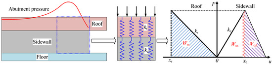 When the overburdened strata load onto the surrounding rock of the roadway, part of the external input energy is stored in the roof rock, and the other part is stored in the sidewall coal. The elastic strain energy Wcs and Wrs of the sidewall and roof are, respectively:
