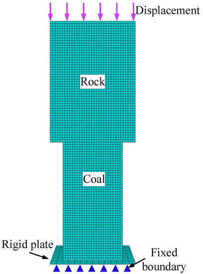 C3D8R eight-node linear hexahedral element was selected as the finite element mesh type of the model, and Abaqus dynamic display solver was used for calculation. Vertical downward axial displacement was applied to the top of the model for loading, and the rigid plate under the model is fixed. The total axial deformation u of the rock–coal system was recorded.