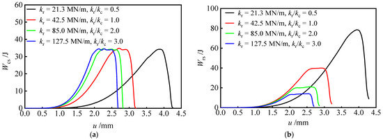 The evolution curves of the elastic strain energy of coal under different stiffness ratios kr/kc are shown in Figure 5a. Under different stiffness ratios kr/kc, the extreme value of the elastic strain energy Wcs of coal is between 34.2 J and 34.6 J, with little change. When the rock stiffness kr changes, the extreme value of the elastic strain energy Wcs of coal will not change, and the rock stiffness kr has little effect on the energy storage property of the coal itself. When the elastic strain energy Wcs of the coal reaches the extreme value of energy storage, the elastic strain energy curve tends to flatten. At this time, the plastic deformation of the coal occurs and the elastic strain energy Wcs does not increase. Under the constant displacement loading speed, when the stiffness ratio kr/kc decreases, the duration of the flattened section of the elastic strain energy Wcs is shortened. For example, when the stiffness ratio kr/kc is 3, the flattened section of the elastic strain energy Wcs needs to be continuously loaded by 0.5 mm, and when the stiffness ratio kr/kc is 0.5, it is reduced to 0.1 mm.