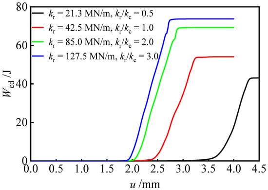 The evolution curves of dissipation energy of coal are shown in Figure 6. Compared with the evolution of coal elastic strain energy in Figure 5a, the dissipation energy Wcd starts to increase before the coal elastic strain energy Wcs reaches the extreme value, indicating that there are micro-cracks generating in the coal before its failure, and some energy is dissipated. When the elastic strain energy Wcs of the coal is fully released and is reduced to 0, the dissipation energy Wcd reaches the maximum value, and the coal is completely fractured. With the decrease in the stiffness ratio kr/kc, the increasing rate of the dissipation energy Wcd of the coal changes little, but the total dissipation energy Wcd decreases gradually. When the stiffness ratio kr/kc is 3.0, the dissipation energy Wcd of coal is 73.8 J, and when the stiffness ratio kr/kc is 0.5, the dissipation energy Wcd is reduced to 43.3 J. When the roof stiffness kr decreases, the dissipation energy Wcd of coal decreases, which indicates that the rapid rebound of the roof rock leads to a decrease in the coal’s plasticity and an increase in brittleness.