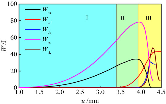 When the stiffness ratio kr/kc is 0.5, the energy evolution curves of the coal and rock are shown in Figure 8. The energy evolution process can be divided into three stages. In the stage I, the coal and rock bear the load together, and their strain energy gradually increases, converting the external input energy into internal elastic strain energy. The dissipation energy Wcd of the coal is zero. In the stage II, before the internal elastic strain energy Wcs of the coal reaches its storage limit, the coal will undergo plastic deformation, and part of the external input energy will be dissipated in the form of plastic deformation energy. At this time, the internal elastic strain energy of the coal and rock will continue to increase. In the stage III, the internal elastic strain energy Wcs of the coal reaches its energy storage limit and begins to decrease (i.e., energy release). The internal elastic strain energy of the coal and the rock is released synchronously. Part of the elastic strain energy Wrs of the rock is converted into its own kinetic energy Wrk, and the other part is supplied to the coal. The elastic strain energy Wcs of the coal is released in the form of kinetic energy Wck and dissipation energy Wcd until the elastic strain energy Wcs drops to zero and the coal is completely fractured.