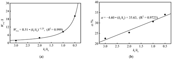 With the decrease in the stiffness ratio kr/kc, the difference between the elastic strain energy Wrs and kinetic energy Wrk of the rock increases, and more energy is supplied to the coal. The changing curves of the supplied energy Wr-c and energy supply rate α are shown in Figure 10. The supplied energy Wr-c and energy supply rate α increase with the decrease in the stiffness ratio kr/kc. The supplied energy Wr-c and the stiffness ratio kr/kc have a power function relationship, and the energy supply rate α and the stiffness ratio kr/kc have a linear relationship. The lower the rock stiffness kr, the more energy supply to the coal [19,30].