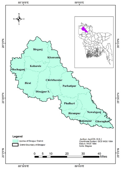 - District Web Portal of Dinajpur (DWBD), Bangladesh. 2021. Available online: http://www.dinajpur.gov.bd/site/page/71fbfc91-18fd-11e7-9461286ed488c766/Background%20of%20the%20District (accessed on 22 April 2022).