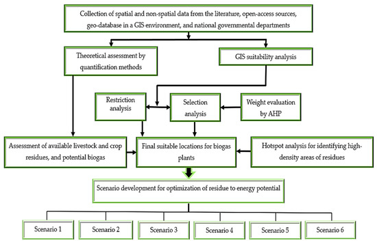 A geographic information system (GIS) is a computer system that examines and demonstrates geographically referenced information (The United States Geological Survey) [22]. In addition to being a vital tool for addressing some of the environmental issues associated with the development of biowaste, the planning of farm waste recycling programs in optimal sites at optimal capacities is both practical and financially feasible. Due to the significant geographical dispersivity of farms, using spatial information technologies like remote sensing and GIS to address the location of bioenergy plants seems to be a beneficial practice. Various studies have used GIS as a suitable tool for site appropriateness, indicating its capacity to address location-related problems. Consequently, this study takes advantage of the opportunities for effective bio-resource mapping. Therefore, the purpose of this study was to establish a logical framework that would act as a road map for choosing appropriate locations for biogas plants using the power of geospatial technology [23].