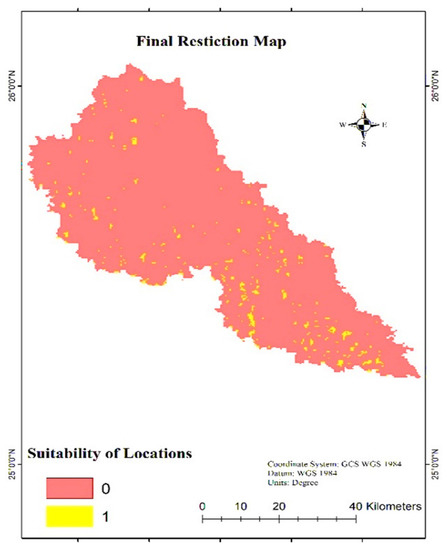 Different GIS shapefiles are used to exclude unwanted areas to illuminate unwanted areas from the final suitable map. The final restriction map was developed by multiplying each restriction map separately in the raster calculator of ArcGIS 10.8.1 and combining all layers to obtain the final restriction map illustrated in Figure 5.