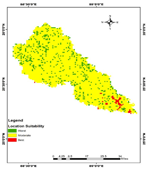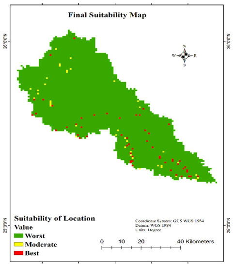 The suitability map has been designed by analyzing the suitability of three factors: roads, rivers, and elevations. After combining them, the lands are modeled with three levels (the worst, moderate, and best) for the less suitable and the best areas for developing biogas plants. The most suitable areas are found in the southern parts, and the most moderate areas are found in the northern areas of the district shown in Figure 6.