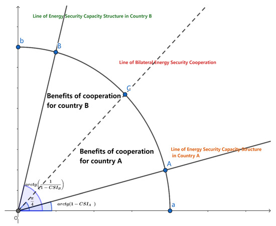 The energy security cooperation capacity of countries A and B is depicted in Figure 1 by the horizontal and vertical axes, respectively. The slope of the line where OA and OB are located is expressed by the function and of the energy security levels of country A and country B, respectively. The regions enclosed by AOC, BOC, and AOB in Figure 1 indicate,