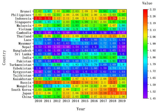 When Table 2 and Figure 2 are combined, it is clear that the top 10 countries in terms of total energy security from 2010 to 2019 were Indonesia, Russia, Japan, Thailand, South Korea, Kazakhstan, the Philippines, China, Brunei, and Malaysia. As can be seen, Central Asia should theoretically have a high level of security if the usual concept of energy supply security is followed. Uzbekistan, Kyrgyzstan, and other nations in this region have a relatively low level of security, albeit, after careful consideration of energy equality and environmental sustainability. Japan and South Korea, on the other hand, retain a relatively high overall degree of energy security while having relatively few energy resources.