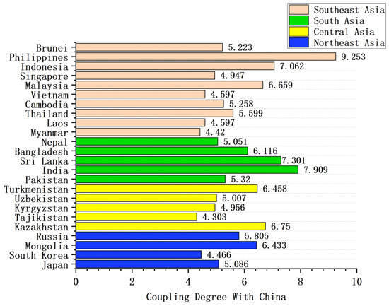 The coupling degree of the bilateral energy security cooperation capability between China and its neighboring countries between 2010 and 2019 is determined by applying Equation (14) in accordance with each country’s sub-dimensional energy security index, and the results are displayed in Figure 4.