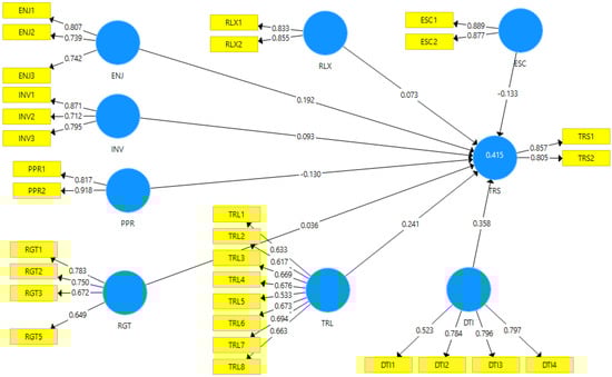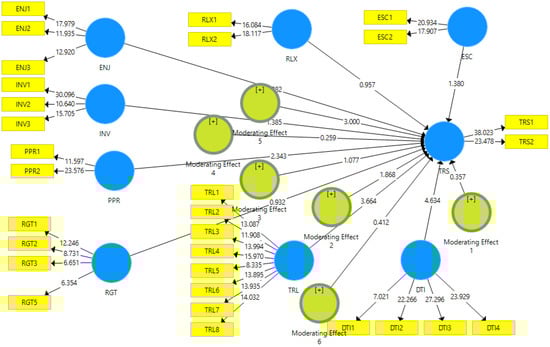 | 6 | Moderating Effect 6 → TRS | −0.028 | 0.067 | 0.412 | 0.681 | Not supportive |