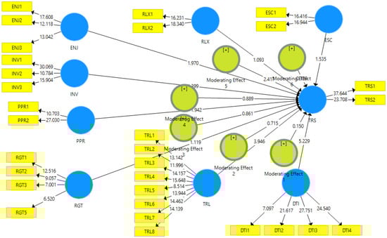 | 5 | Moderating Effect 5 → TRS | −0.139 | 0.046 | 3.000 | 0.003 * | Supportive |