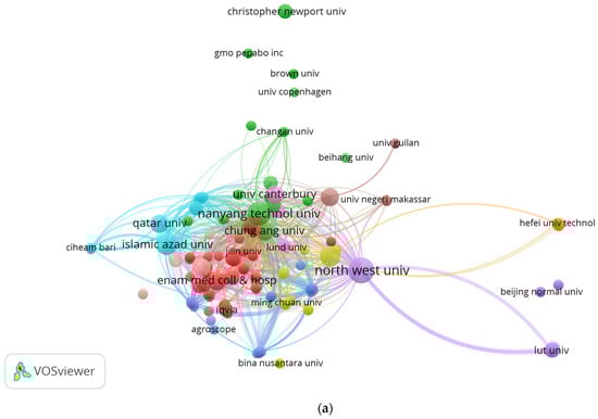 Furthermore, a cooperation analysis of the institutions was conducted. A visualization of the collaborative relationships is presented in Figure 6a,b. Figure 6a displays 150 institutions grouped under 10 clusters (minimum of one document). Again, 10 clusters for 150 institutions proved strong associations. The top 10 institutions have led strong collaborations with others. Northwest University leads the pack, followed by Nanyang Technological University, Griffith University, and Islamic Azad University. Northwest University had the maximum link strength too.
