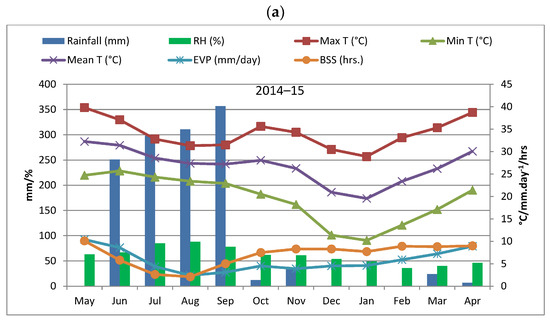 (a–c) Weather information during 2014–15, 2015–16, and 2016–17. RH = relative humidity, Max T = maximum temperature, Min T = minimum temperature, Mean T = mean temperature, EVP = evaporation, BSS = bright sunshine.