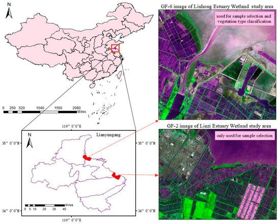 Two coastal wetlands in Lianyungang, Jiangsu province, China, were selected as the study area, including the Linhong Estuary Wetland and Liezi Estuary Wetland. The Linhong Estuary Wetland (119°11′37″–119°16′33″ E, 34°45′37″–34°49′15″ N) is located in the northern part of the Lianyungang coastal zone, while the Liezi Estuary Wetland (119°35′24″–119°44′54″ E, 34°28′37″–34°33′15″ N) is located in the southern part of Lianyungang. The distance between these two areas is about 49 km, and their coverage is about 102 km2 and 64 km2, respectively (Figure 1). Of the two areas, the Linhong Estuary Wetland was the main study site in which most of the samples used in the time series construction were surveyed and vegetation type classification was carried out. In contrast, for the Liezi Estuary Wetland, only four scene images from a recent four-year period (2018–2021) were acquired and used to provide samples for time series construction. All data used in this study are shown in Table 1.