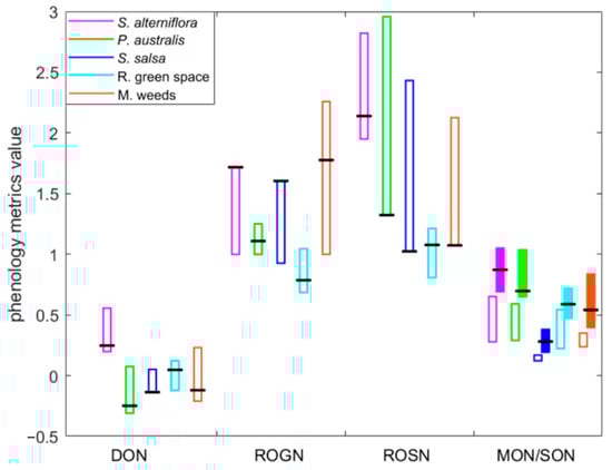Phenology metrics are constructed to identify the above characteristics. Illustrated as Figure 4, these metrics values of five vegetation types fluctuate in a certain range when the images used to calculate metrics are located in different positions of the optimized window. However, some common traits in favor of improving the classification result are obvious, including: (1) The DON value of S. alterniflora is higher than those of other vegetation types. (2) Both ROGN and ROSN values of R. green space tend to be lower than those of other vegetation types. (3) For five vegetation types, the values of MON and SON have similar comparison characteristics, which means SON can be used to surrogate MON, and the S. salsa value of both MON and SON is lowest among the five vegetation types.