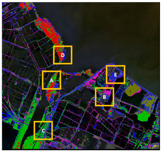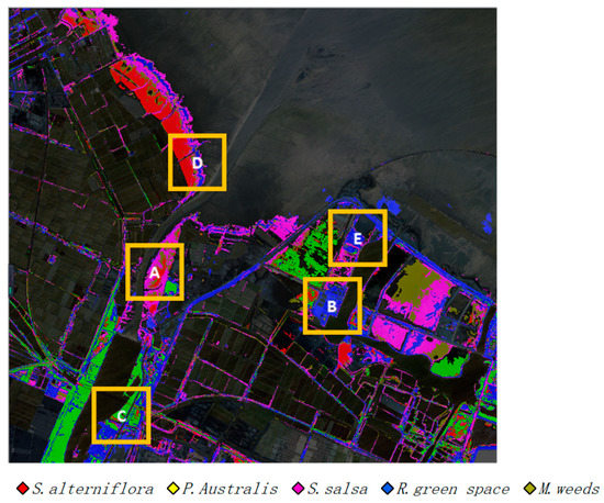 Vegetation classification result by single image of 8 May 2021: (A) S. alterniflora classified as P. australis mistakenly; (B) S. salsa classified as R. green space mistakenly; (C) P. australis classified as R. green space mistakenly; (D) S. alterniflora classified as R. green space mistakenly; (E) P. australis classified as R. green space mistakenly.