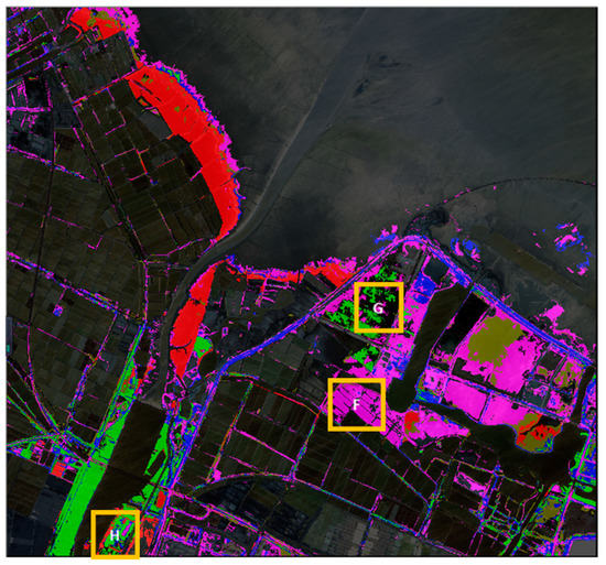 Vegetation classification result with combination of two images: (A) S. alterniflora omission error decreased; (C) P. australis omission error decreased; (F) S. salsa omission error decreased; (D) S. alterniflora classified as R. green space mistakenly; (G) P. australis classified as M. weeds mistakenly.