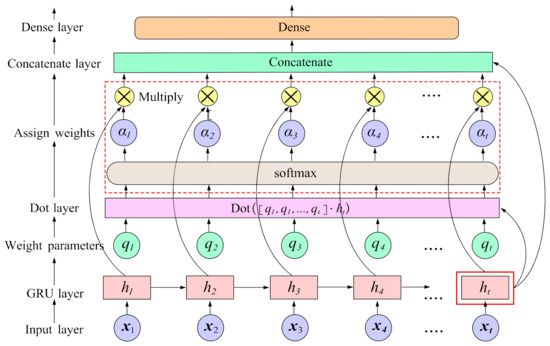 As shown in Figure 2, the attention mechanism is added to the encoder–decoder structure. In the process of encoding and decoding, the attention mechanism allocates weights and sums them according to the importance of different information elements. Therefore, the attention mechanism can help the model judge the importance of different information in the sequence, and improve the weight of important information, so as to improve the learning efficiency of the model. The result of weighting and summing feature information by the attention mechanism is . In equation: is the weight value; is the hidden value of the encoder part; is the number of hidden values.