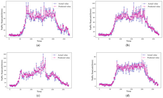 Comparison between predicted results and actual values. (a) Jilan Road. (b) Qingwei Road. (c) Mocheng Road. (d) Haier Road.